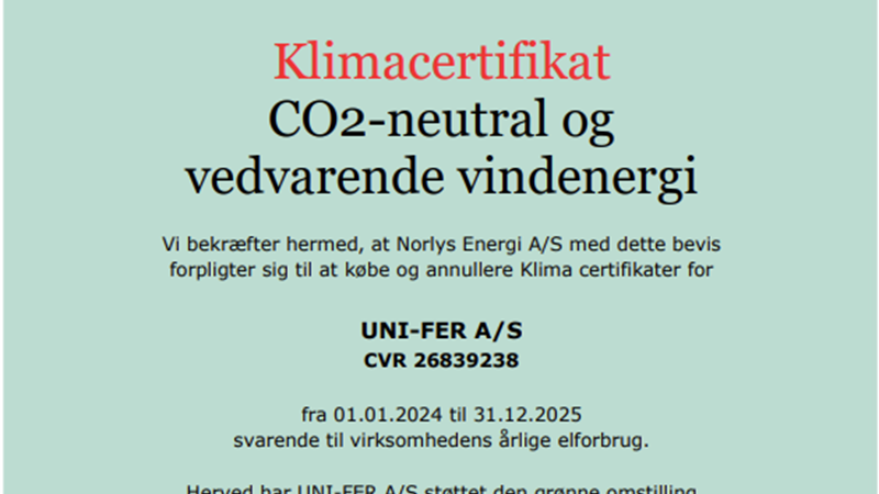 Hos UNIFER forarbejdes al armering fra 1. januar 2024 udelukkende med klimacertificeret strøm. Med Norlys’s klimacertifikat for CO2 neutral og vedvarende vindenergi, forpligter de sig til at købe Klima certifikater for UNIFER svarende til vores årlige elforbrug.